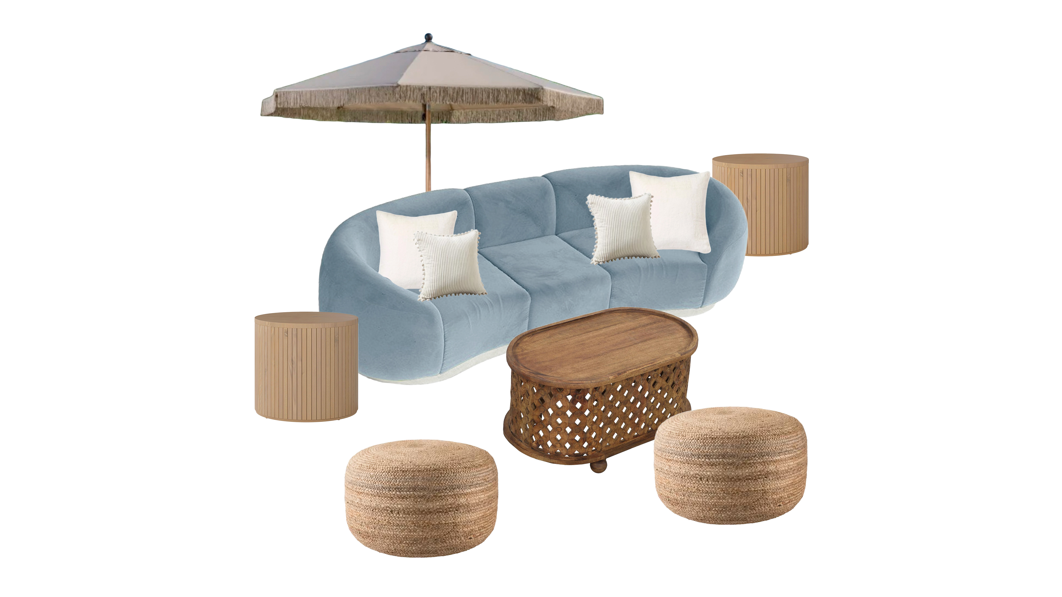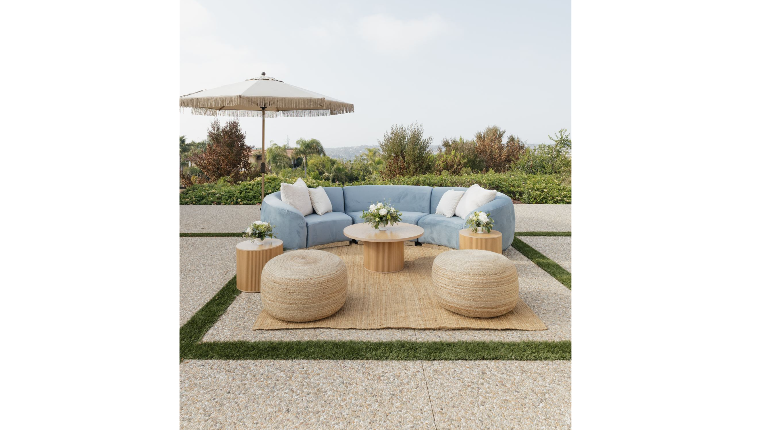 Is this La Jolla or Tulum? Relax in style in the sun or shade! Featuring our Coppen Blue Moonlight Cascade Arc Sofa, Mango Wood Coffee Table, Oversized Beige Jute Pouf, and Beige Fringe umbrella.