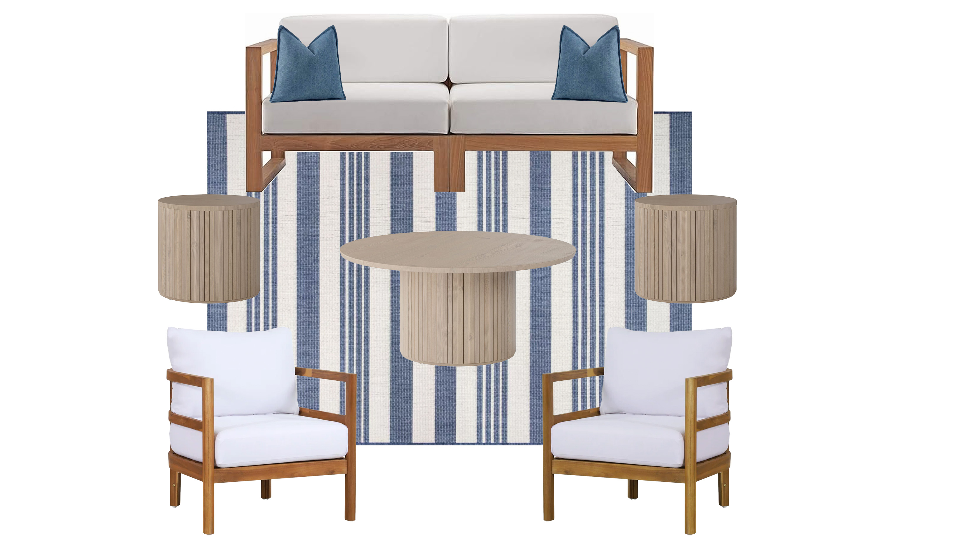 Rich wood tones, ocean blue accents and crisp neutrals make this lounge a modern coastal vibe. Includes teak wood sofa, two coastal club chairs, two dusty blue pillows, a striped blue rug, two Cardiff side tables and a Cardiff coffee table.