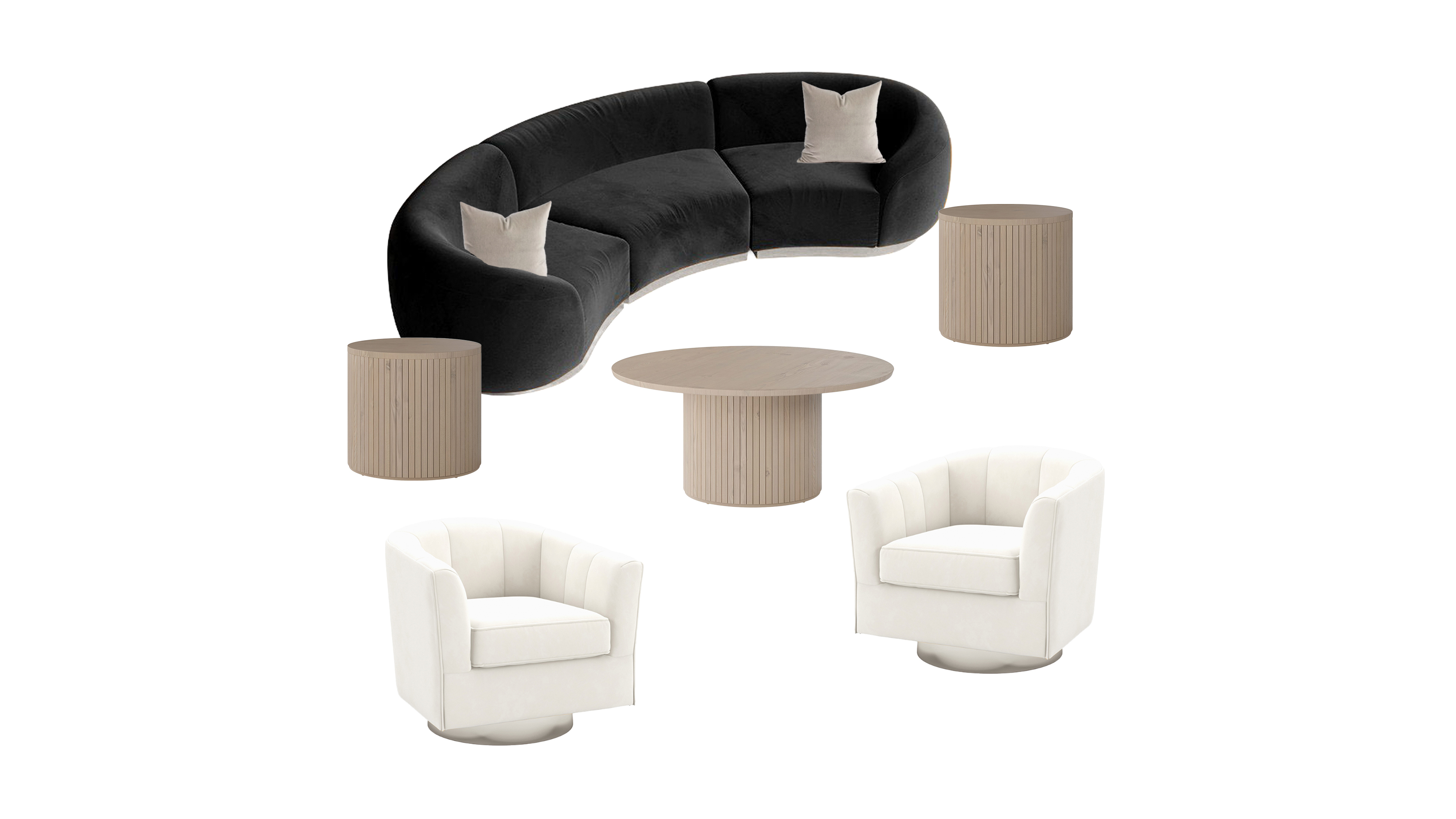 Combines our Moonlight and Cardiff Collection for a fresh new lounge feel. Includes the Cascade Arc Black Velvet sofa, two white velvet chairs, Cardiff coffee table, two Cardiff side tables and two grey velvet pillows.